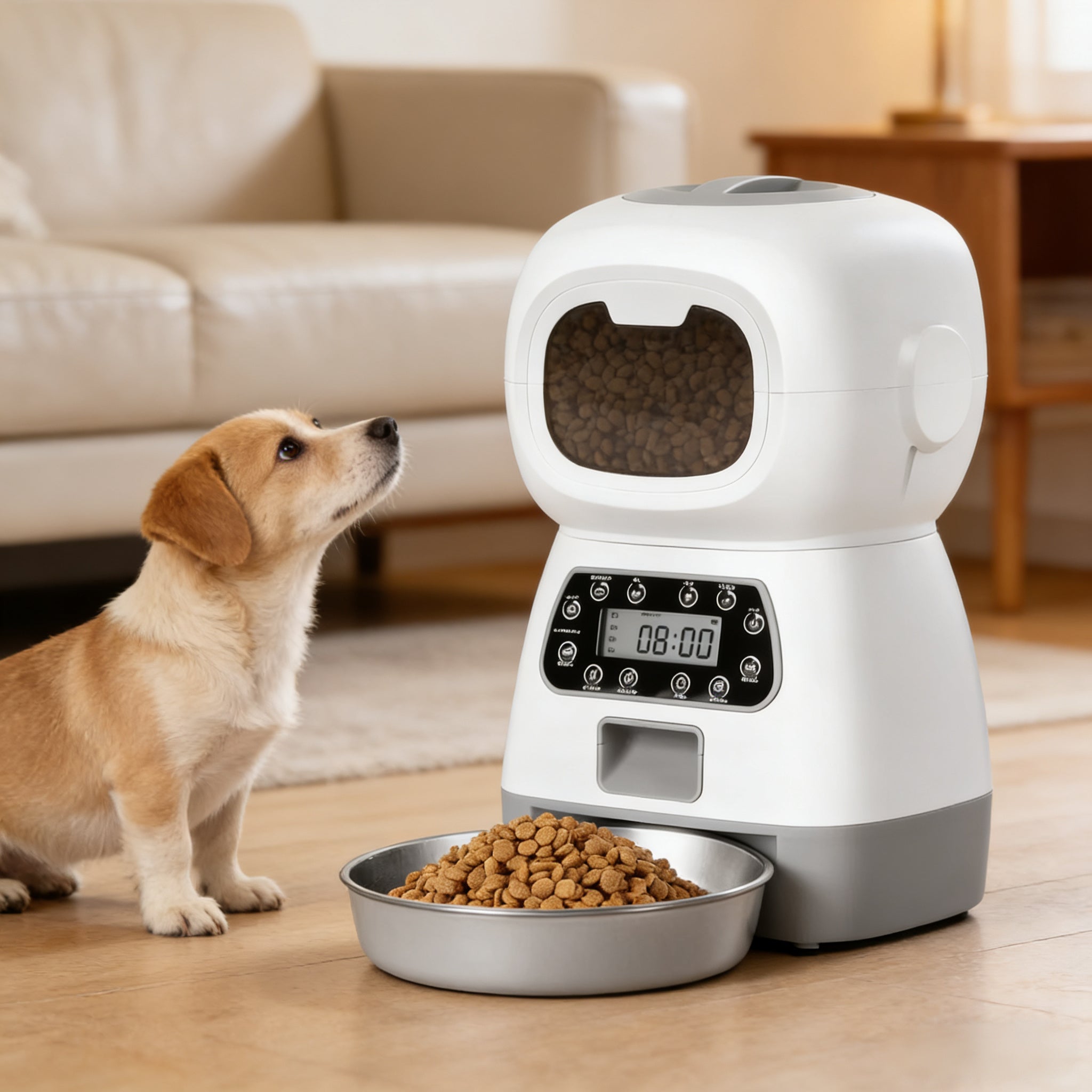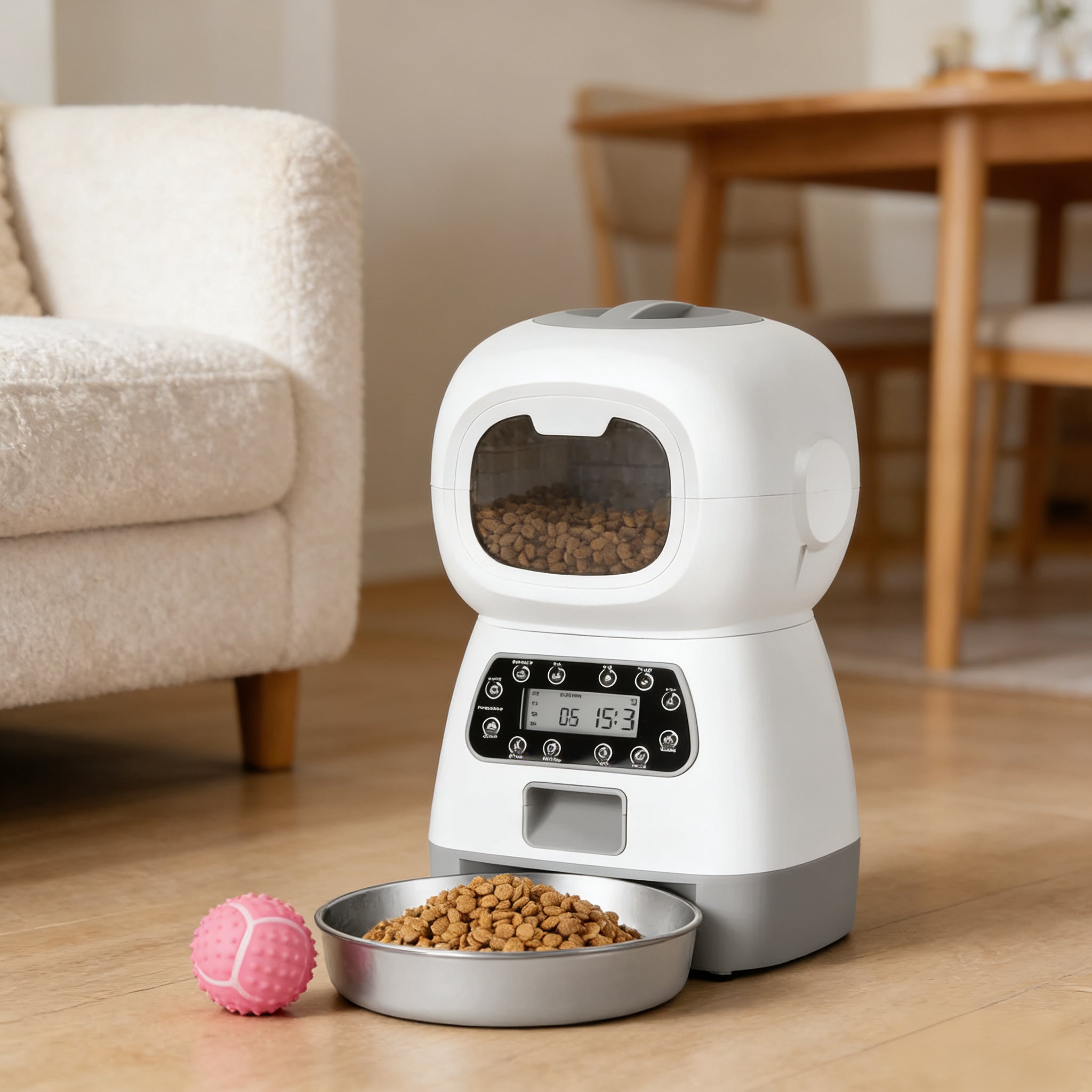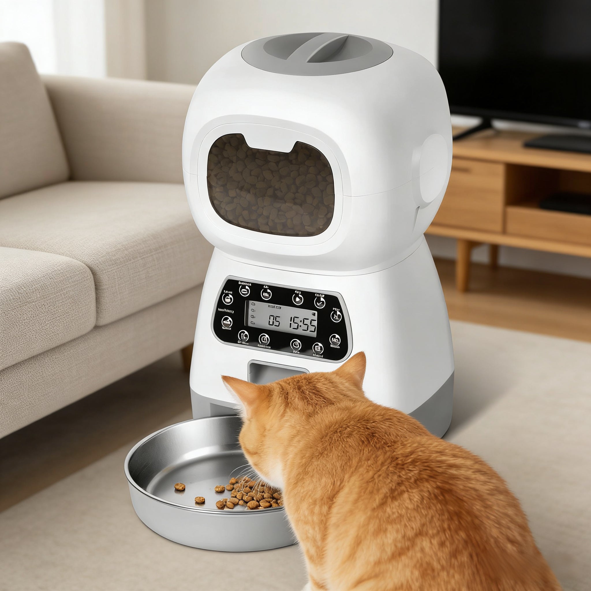 - Smart Programmable Timer: Set up to 4 meals per day with portions from 1-20 scoops. The clear LCD screen lets you schedule feeding times down to the minute, so your pet sticks to a consistent, healthy routine.