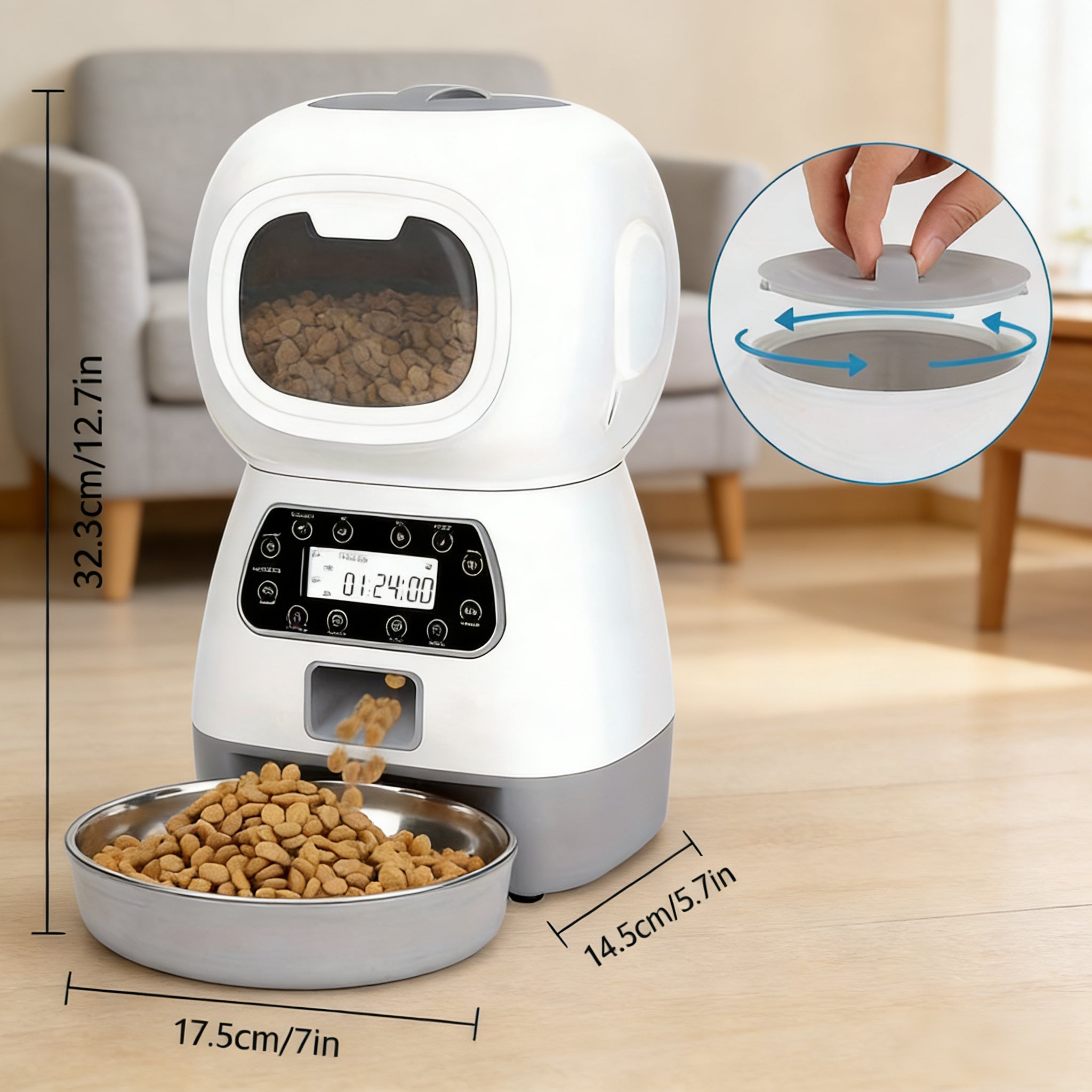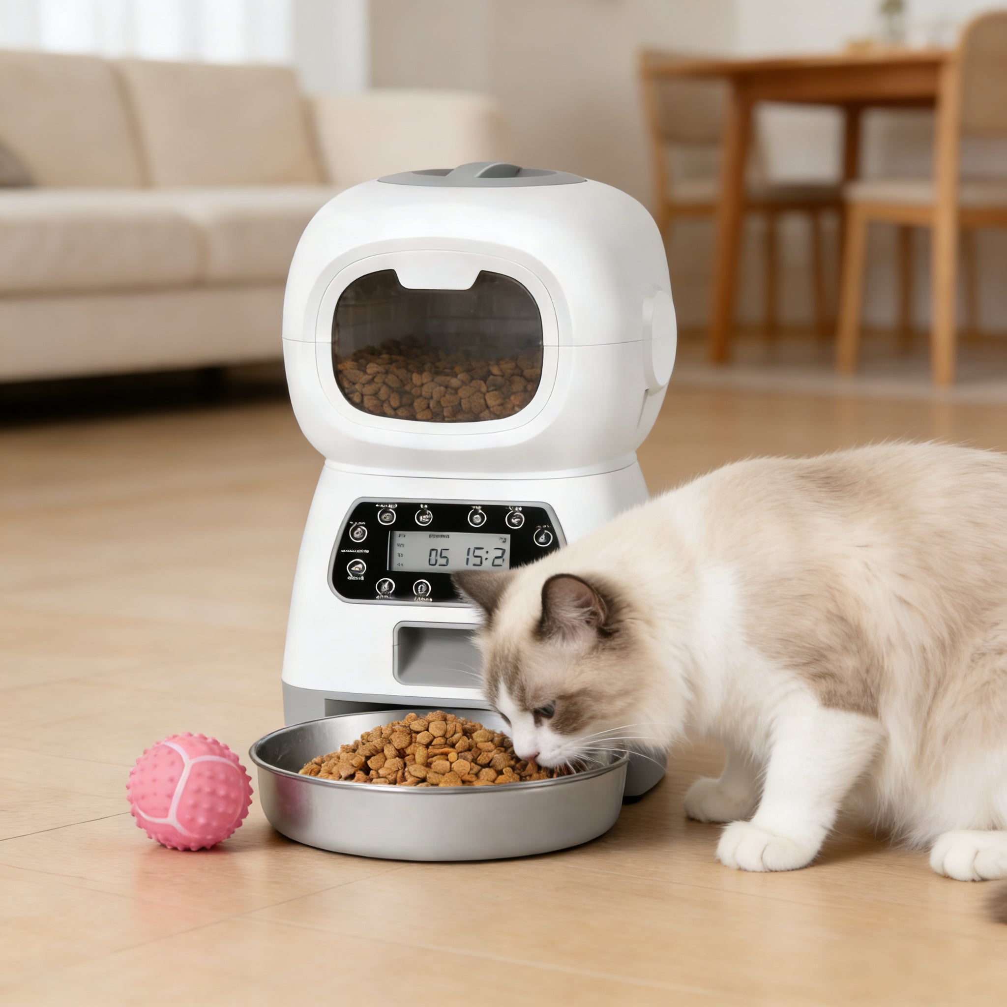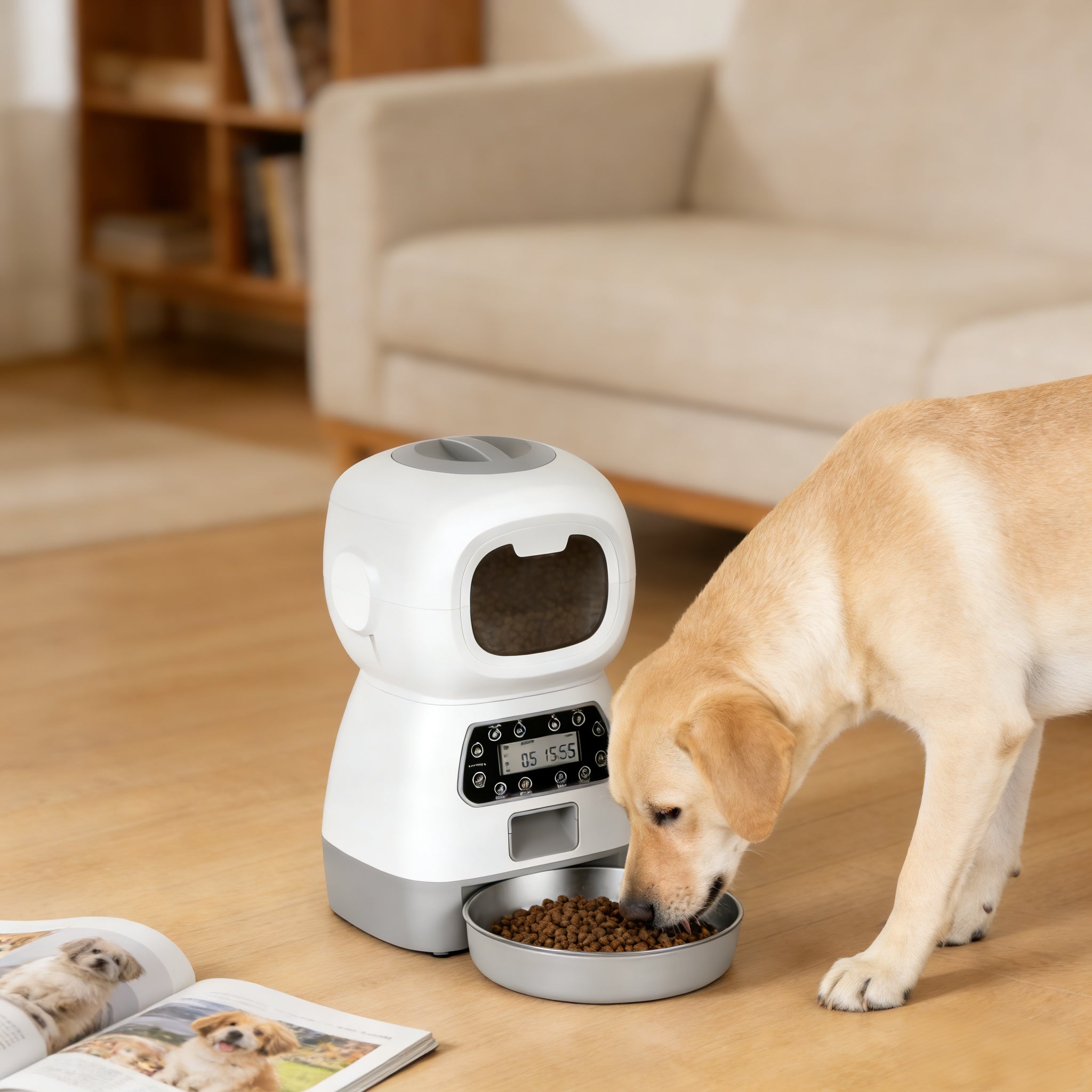 - Smart Programmable Timer: Set up to 4 meals per day with portions from 1-20 scoops. The clear LCD screen lets you schedule feeding times down to the minute, so your pet sticks to a consistent, healthy routine.