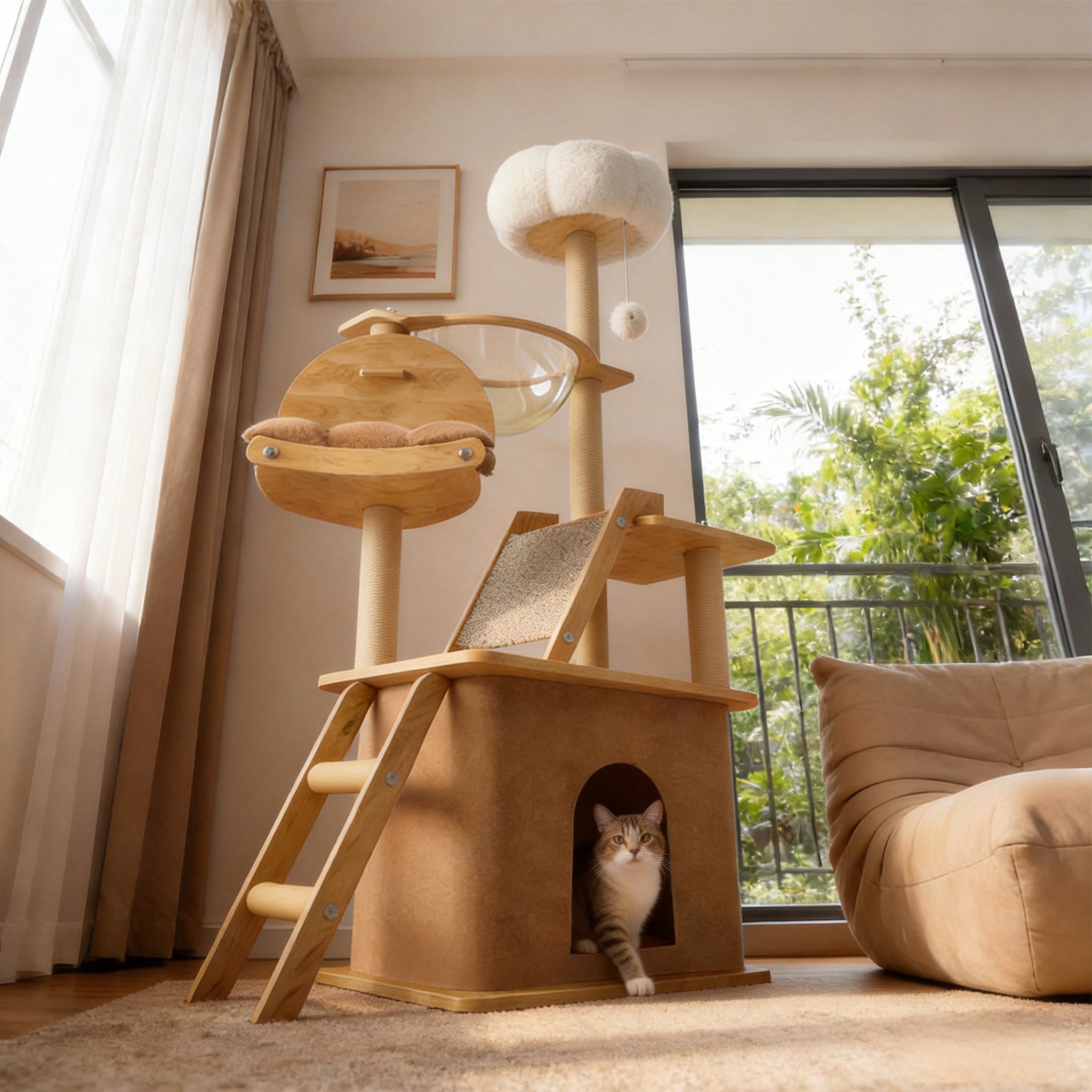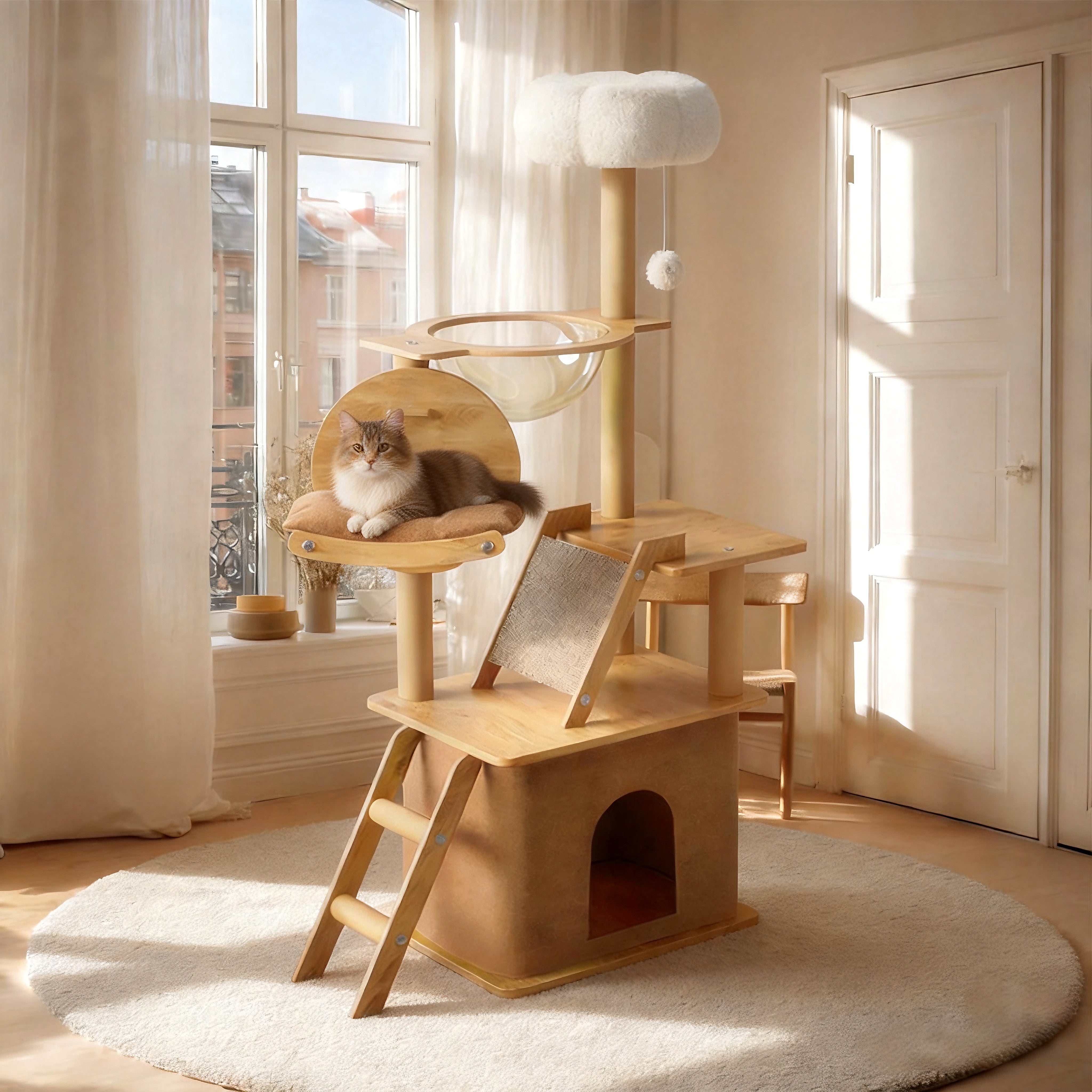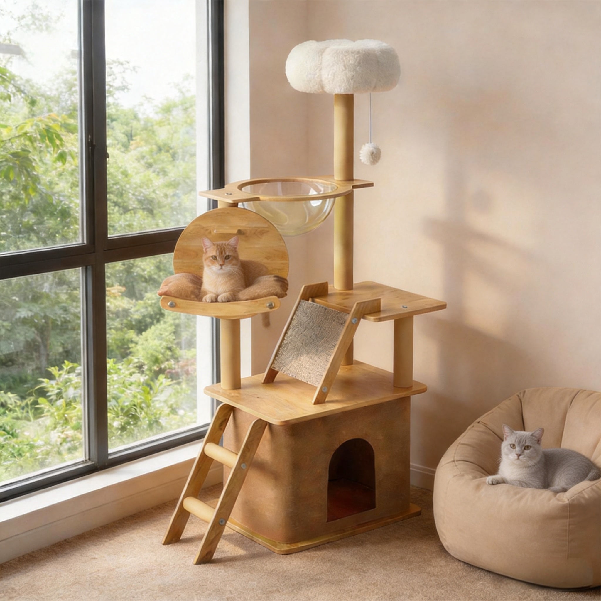 Multi-Functional Design: Combines climbing, playing, scratching, and resting with a ladder, plush perch, hideaway, and large transparent capsule.