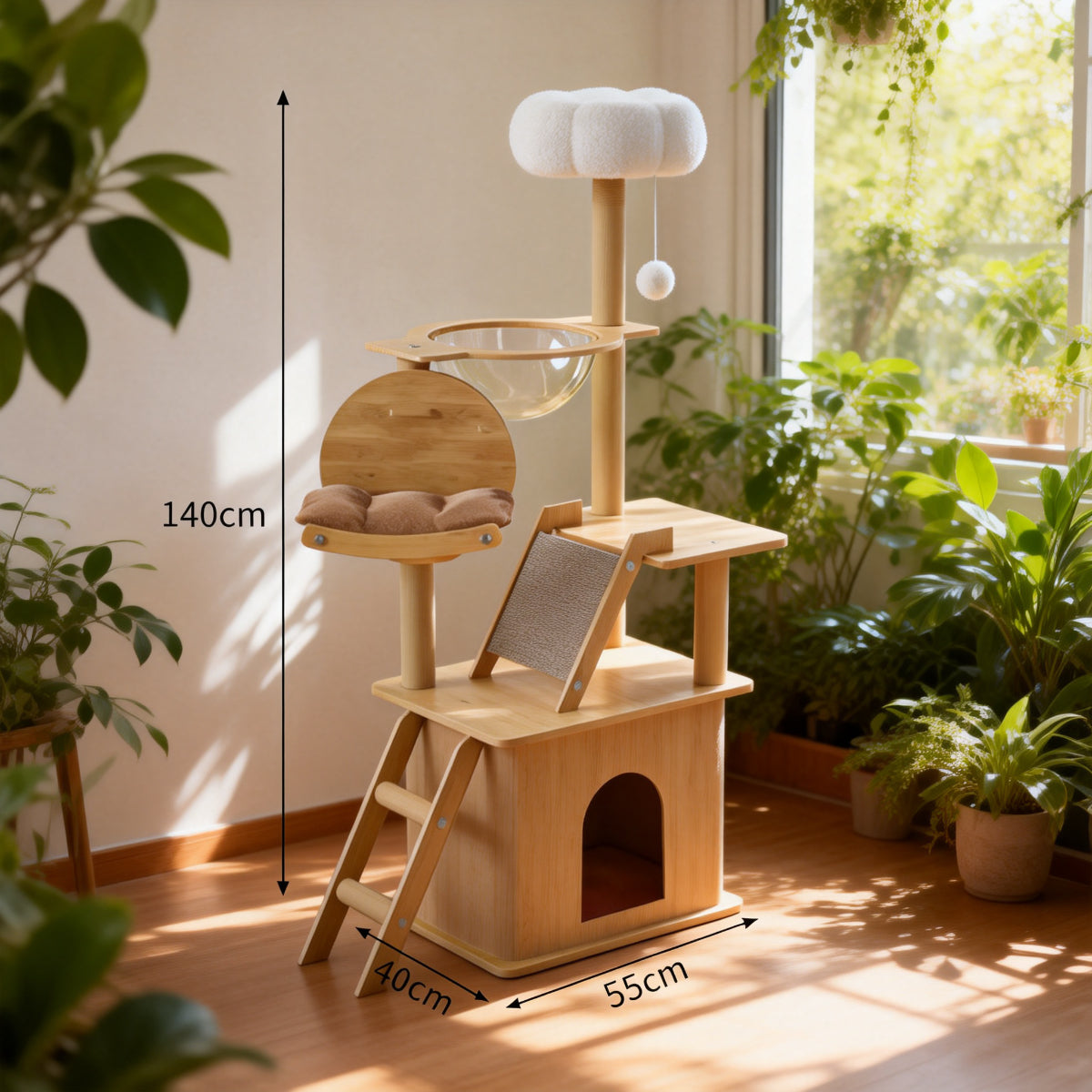 With dimensions of Height 140 cm Γ Width 40 cm Γ Length 50 cm, this all-in-one cat tree fits most rooms while giving cats ample space to climb, jump, and lounge comfortably.